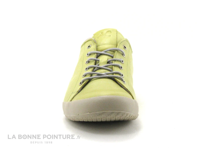 Le cuir souple de la chaussure se remarque avec sa belle couleur vert citron et ses légères nuances.