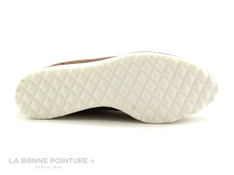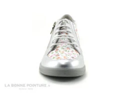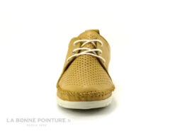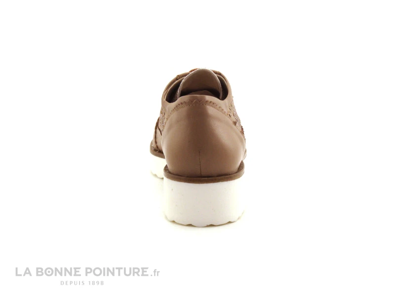 Cette chaussure Femme est en cuir marron clair, avec des empiècements argent mĂ©tal, de fines perforations et des dĂ©coupes dentelĂ©es…