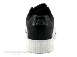 La partie arrière de la chaussure Femme Kappa est finement poinçonnée,avec un empiècement noir verni gravé du logo Kappa en argenté.