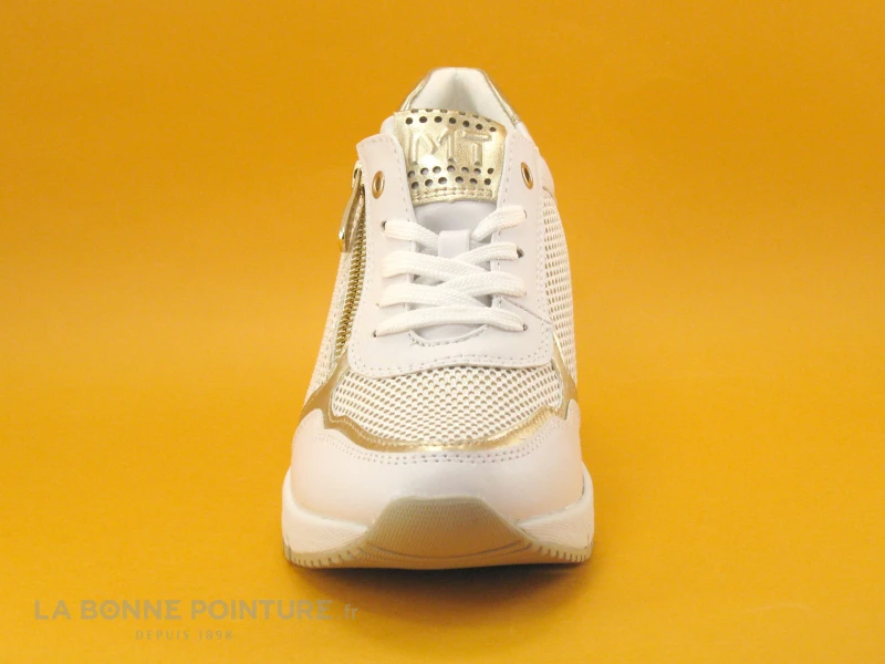 Cette belle basket à talon compensé Marco Tozzi 23743 est blanche et or, avec des parties en maille sur fond doré.