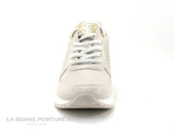 Cette basket basse Femme est blanche et beige, avec des bandes aspect python ainsi que l’arrière dorĂ©.